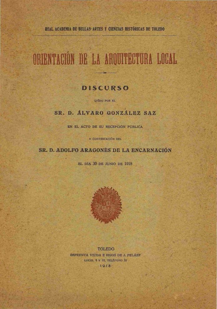 GONZÁLEZ SAZ, Álvaro, Orientación de la arquitectura local : discurso leído por… en el acto de su recepción pública y contestación del Sr. D. Adolfo Aragonés de la Encarnación el día 30 de junio de 1918, Toledo : Real Academia de Bellas Artes y Ciencias Históricas de Toledo (Imp. de viuda e hijos de J. Peláez), 1918, 40 p.