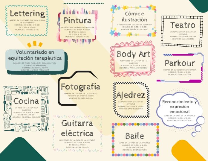 El centro cultural ‘Ciega de Manzanares’ acogerá el de lettering (martes de 16 a 17 horas y 17 a 18 horas, monitora Virginia Caro). En la Universidad Popular el de pintura (viernes de 16 a 17:20, de 17:30 a 18:50 y de 19 a 20:20 horas, monitora Virginia Caro). En el colegio ‘Altagracia’ el de parkour (viernes de 17 a 19 horas, monitor Fran Quezada). Y en la finca de la Fundación ‘Caballo Ayuda’ el de voluntariado en equitación terapéutica (sábados de 11 a 13 horas, monitor Antonio Fernández).