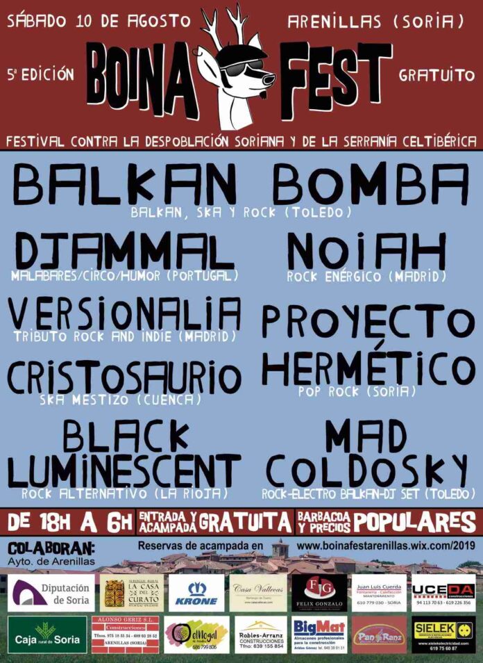 La 5ª. Edición del Boina Fest y el 1er Festival contra la despoblación soriana y de la Serranía Celtibérica tendrá lugar este sábado 10 de agosto a partir de las 18 h de la tarde. Este festival que es gratuito tiene como fin primordial luchar contra la despoblación y asimismo, visibilizar el problema generando un espacio cultural para que artistas de la Serranía Celtibérica y foráneos que usualmente no se presentan en una de las zonas más despobladas de España. El festival espera congregar a más de 500 personas, lo que implica multiplicar su población por 10. Los asistentes al festival, podrán disfrutar de una zona de acampada, también gratuita y con zonas de sombra, simplemente reservando en la web del festival, pinchando en el siguiente enlace https://boinafestarenillas.wixsite.com/2019/acampada