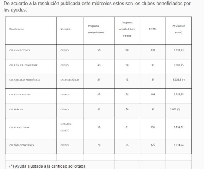 En total, serán siete los clubes deportivos que recibirán fondos para organizar actividades en municipios como Cuenca capital, Las Pedroñeras o Mota del Cuervo. Los importes asignados van desde los 3.000 hasta los 9.750 euros.