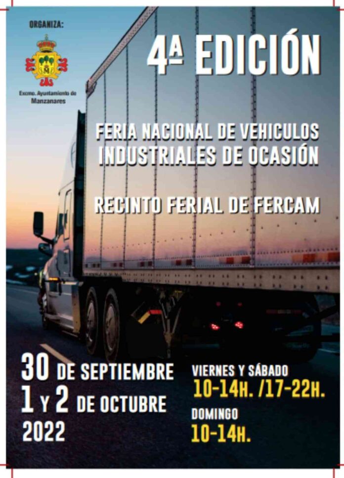 La cuarta edición de la Feria Nacional de Vehículos Industriales de Ocasión se celebrará en el recinto ferial de Fercan en Manzanares (Ciudad Real) el próximo 30 de septiembre y el 1 y 2 de octubre. En horario de 10 a 14 horas y de 17 a 22 horas, el viernes y sábado. Mientras que el domingo será de 10 a 14 horas.