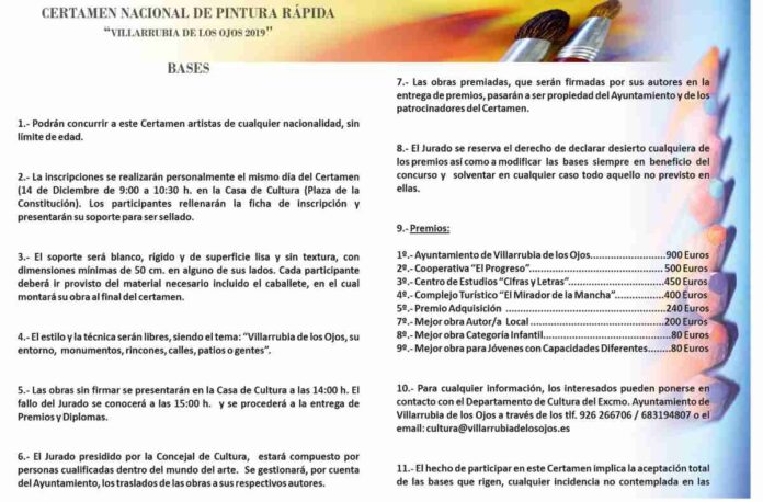 El estilo y la técnica del Concurso de Pintura Rápida, serán libres. Y el tema será “Villarrubia de los Ojos, su entorno, monumentos, rincones, calles, patios o gentes”. Las obras sin firmar se presentarán en la Casa de Cultura a las 14 horas. El fallo del Jurado se conocerá a las 15:00 horas. Y se procederá a la entrega de Premios y Diplomas. El Jurado se reserva el derecho de declarar desierto cualquiera de los premios. Así como a modificar las bases siempre en beneficio del concurso. Y solventar en cualquier caso todo aquello no previsto en ellas. Más información en la web municipal www.villarrubiadelosojos.es