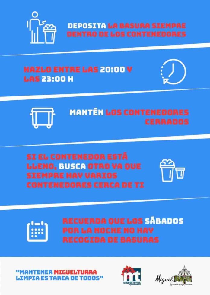 El horario para depositar la basura debe de estar comprendido entre las 20:00 y las 23:00 horas. De ese modo evitamos las horas de más calor con los contenedores llenos de basura con el mal olor que desprenden y las molestias que ocasionan a los vecinos.