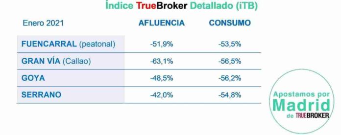 Aun así y, por muy poco margen, la calle Fuencarral peatonal siguió siendo la calle en la que menos cayó el consumo durante el mes de enero de 2021 (-53,5%) con respecto al mes de enero de 2020, y si tomamos el dato de la segunda quincena de enero 21, en la que ya se pudieron abrir los comercios, aunque con muchas dificultades, el consumo cayó -38% con respecto a la segunda quincena del 2020.