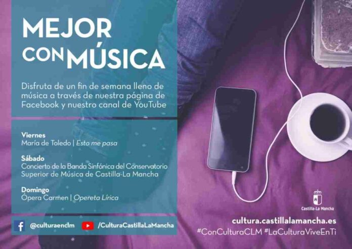 Durante todo el fin de semana se podrá disfrutar en el canal de Youtube de Cultura Castilla-La Mancha de actuaciones de artistas. Para ello, la consejería de Educación, Cultura y Deportes dentro de la iniciativa “La Cultura Vive en Ti” y bajo el título “Mejor con Música” ha programado una variada oferta musical online.