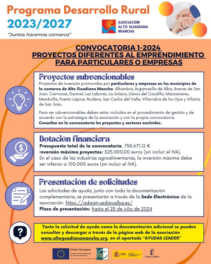 La Asociación Alto Guadiana Mancha, con sede en Ciudad Real, ha anunciado la apertura del plazo para participar en la Convocatoria 1-2024, la primera subvención del nuevo Programa de Desarrollo Rural 2023-2027. Este programa cuenta con un presupuesto total de 758.671,12 euros, financiado con fondos europeos LEADER, y está dirigido a financiar proyectos de inversión impulsados por particulares y empresas en la comarca de Alto Guadiana Mancha.