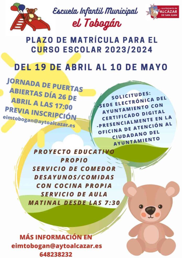 La concejalía de Educación del Ayuntamiento de Alcázar de San Juan abre, desde hoy 19 de abril, el plazo de matrícula para el acceso de alumnos de 0 a 3 años en la Escuela Infantil Municipal ‘El Tobogán’ para el curso escolar 2023-2024. Por este motivo, el centro ha decidido organizar una jornada de puertas abiertas (previa inscripción) el día 26 de abril, a las 17:00, con el objetivo de dar a las potenciales familias interesadas la posibilidad de conocer los proyectos, el edificio y el funcionamiento de la escuela.