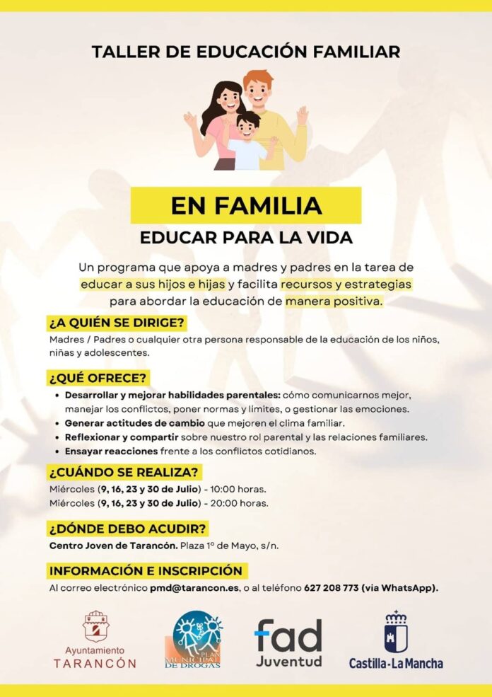 Este miércoles 9 de julio, Tarancón dará inicio al taller de educación familiar ‘En familia’, que se llevará a cabo todos los miércoles del mes en el Centro Joven. Las personas interesadas en participar pueden inscribirse llamando por teléfono, enviando un mensaje por WhatsApp al 627208773, o a través del correo electrónico pm@.on.es.