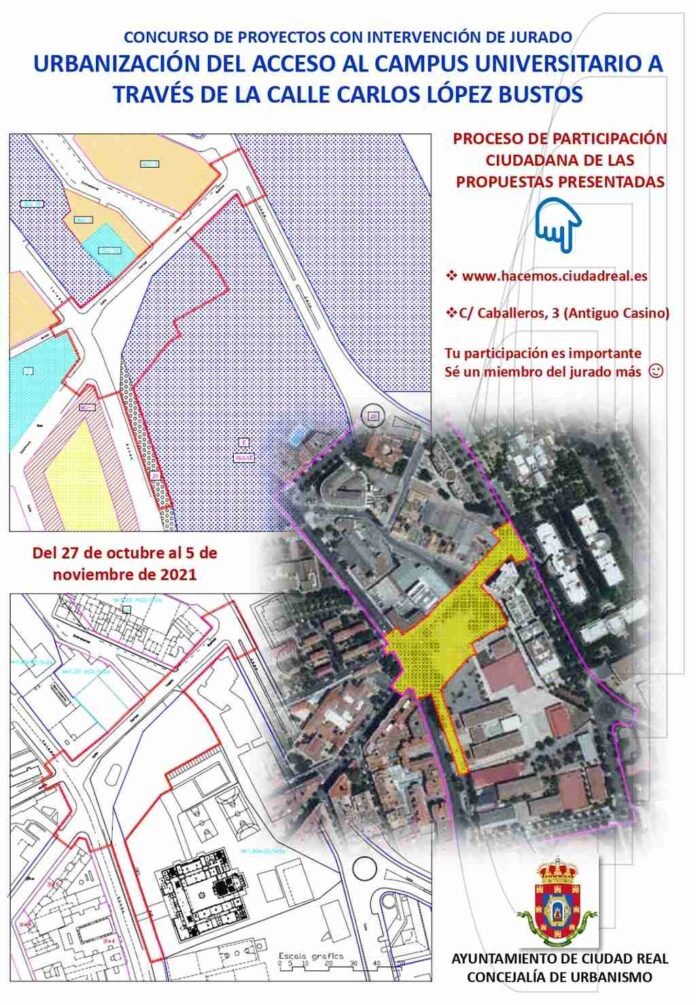 Del 27 de octubre al 5 noviembre, todos los ciudadanos que quieran pueden participar en la votación popular del concurso de ideas para mejorar el acceso a la universidad por la calle Carlos López Bustos. Este novedoso método de participación ciudadana tiene como objetivo seleccionar la mejor propuesta que, por sus planteamientos arquitectónicos y urbanísticos originales, viabilidad técnica y económica sea valorada por los miembros del Jurado como la mejor y más idónea para el proyecto de urbanización.Se trata de un concurso abierto, anónimo, con intervención de jurado donde la Participación Ciudadana es importante y los resultados de la misma se incorporará como un miembro del tribunal más.