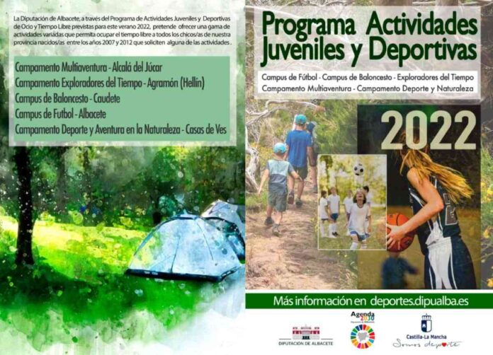 A través del Programa de Actividades Juveniles y Deportivas de Ocio y Tiempo Libre para el verano 2022, la Diputación de Albacete quiere ofrecer varias actividades para ocupar el tiempo libre de todos los los chicos/as de la provincia nacidos/as entre los años 2007 y 2013 que soliciten alguna de las actividades, que se detalla en las imágenes que ilustran esta nota.