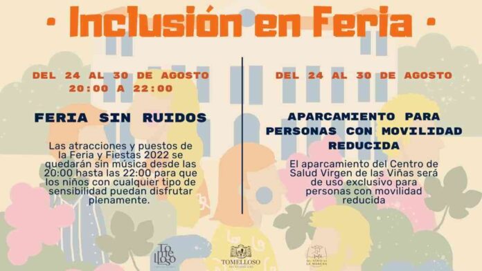 Con las acciones inclusivas dentro de la Feria de Tomelloso (Ciudad Rreal) de las atracciones y puestos del ferial, los niños con sensibilidad auditiva podrán disfrutar de ellas. Las personas con movilidad reducida tendrán una zona exclusiva de aparcamiento para vehículos.