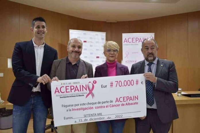 El rector de la Universidad de Castilla-La Mancha (UCLM), Julián Garde, y la presidenta de la Asociación Costuras en la Piel en Apoyo a la Investigación de Cáncer (Acepain) en Albacete, Joaquina Alarcón, han mostrado de nuevo su estrecha colaboración en la lucha contra el cáncer con la entrega del cheque por valor de 70.000 euros que la asociación ha donado a la institución académica, con el fin de continuar trabajando en materia de investigación en el avance científico y la lucha contra esta enfermedad.