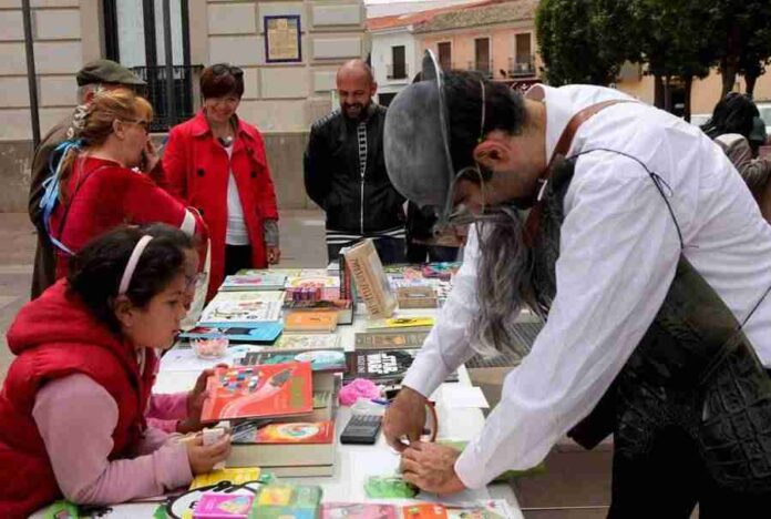 La Plaza de España acogió la iniciativa de dos librerías locales – Mata e Imagina- que montaron dos puestos de venta de libros e invitaron a los viandantes a confeccionar flores de papel para decorar un mural. Las figuras de Don Quijote y Sancho Panza estuvieron muy presentes en este marco, gracias a dos simpáticos cabezudos que fomentaron la lectura entre los más pequeños.