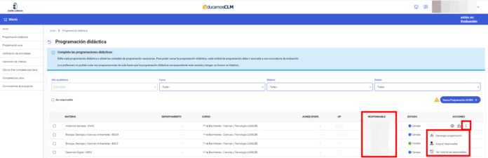 El cuaderno de evaluación ha evolucionado para ofrecer nuevas funcionalidades a los docentes, con la implementación de opciones de gestión de programaciones didácticas en perfiles de dirección, jefes de departamento y coordinadores de ciclo. Ahora es posible asignar en la aplicación al responsable de las programaciones, permitiendo cambios incluso cuando estas están cerradas y guardando un histórico de responsables. Esta mejora permite una mejor organización y reparto de tareas basado en decisiones de coordinación del centro. Aunque tendrá mayor impacto en las programaciones del próximo curso, se ha puesto a disposición del profesorado para generar informes competenciales en la evaluación final. Es requisito que las programaciones estén creadas y cerradas, y que los miembros de la junta de evaluación introduzcan las calificaciones por criterios de evaluación.