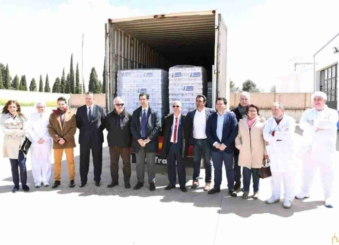 El presidente de la institución provincial, José Manuel Caballero, acompañado por el vicepresidente David Triguero y por el diputado provincial y alcalde de Malagón, Adrián Fernández, ha visitado esta mañana la fábrica de Conservas Huertas, desde donde han partido en el día de hoy dos contenedores que se incorporarán a la primera de las dos caravanas españolas que se envían durante el año.