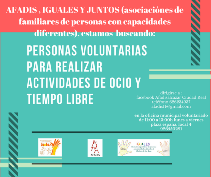 Las personas interesadas pueden dirigirse al correo de Afadis : af******@***il.com ,al teléfono 626234937, por facebook en afadisalcazar ciudad real o en la oficina municipal de voluntariado situado en el local 4 de la Plaza de España, de lunes a viernes de 11:00h a 13:00h y teléfono 926550291.
