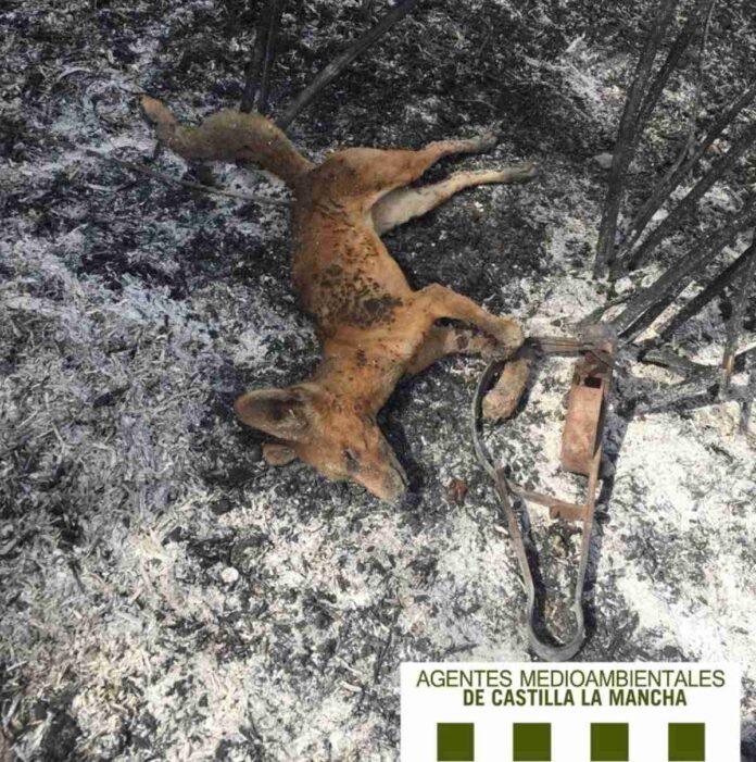 Agentes medioambientales de Castilla-La Mancha, encontraron el cadáver quemado de un zorro de apenas un año de edad. Los agentes realizaban una investigación de un incendio en la provincia de Toledo. El cadáver del zorro de apenas un año de edad se encontraba atrapado entre la vegetación que estaban analizando. Al parecer el animal quedó atrapado en el artefacto donde pudo permanecer varios días tratando de liberarse. Además, tenía una pata fracturada a causa de la fuerte presión del cepo sobre ella.