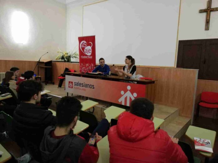 El presidente de la junta local de AJE Puertollano, Jorge Narváez, y Miriam Gómez, miembro de la junta directiva, han participado esta mañana en una jornada con más de medio centenar de alumnos de segundo de Bachillerato del centro educativo Salesiano San Juan Bosco de la ciudad minera, para fomentar en ellos la cultura del emprendimiento y de la importancia de impulsar las ideas, a través de sus propias experiencias como jóvenes empresarios.
