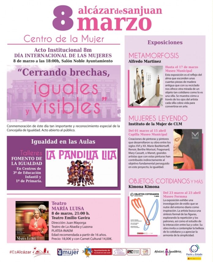 El Día Internacional de la Mujer, que conmemora cada 8 de marzo la lucha de las mujeres por su participación en la sociedad y su desarrollo íntegro como persona, tiene cada año un hueco especial en Alcázar de San Juan. En este 2024, bajo el lema «Cerrando Brechas: Iguales y Visibles», nuestra ciudad cuenta con un amplio abanico de actividades orientados hacia la mujer, con reconocimientos, formación en aulas, teatro y exposiciones.