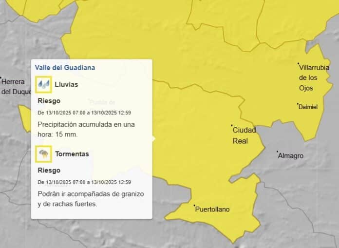 Puertollano está en aviso amarillo por tormentas hasta las 13 horas, según ha informado el servicio municipal de Protección Civil. Se estima una probabilidad de lluvia que oscila entre el 40% y el 70%. La Agencia Estatal de Meteorología prevé que en la comarca se presenten tormentas fuertes, incluso de intensidad superior de forma puntual.