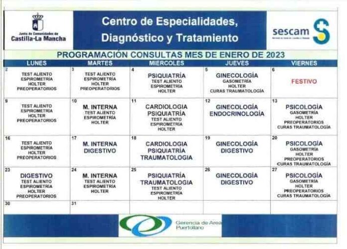Listado de especialistas y consultas del Centro de Especialidades de Almadén para el mes de enero 2023.