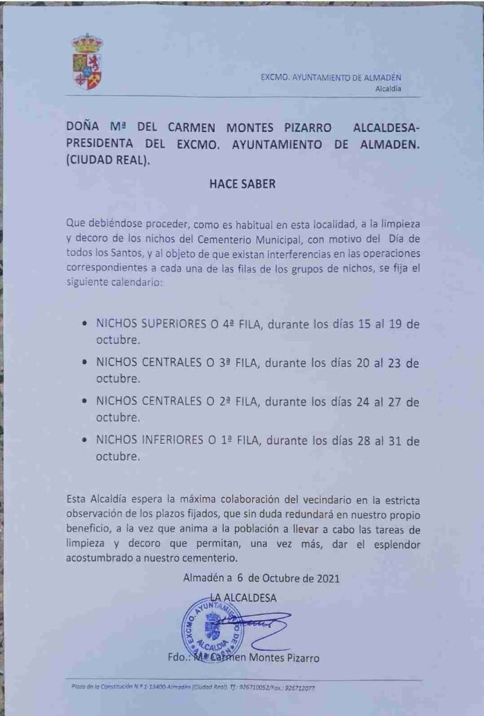 El nuevo horario del cementerio municipal de Almadén desde el 15 de octubre al 2 de noviembre será de 8 a 18 horas y calendario de limpieza de nichos para el 2021.