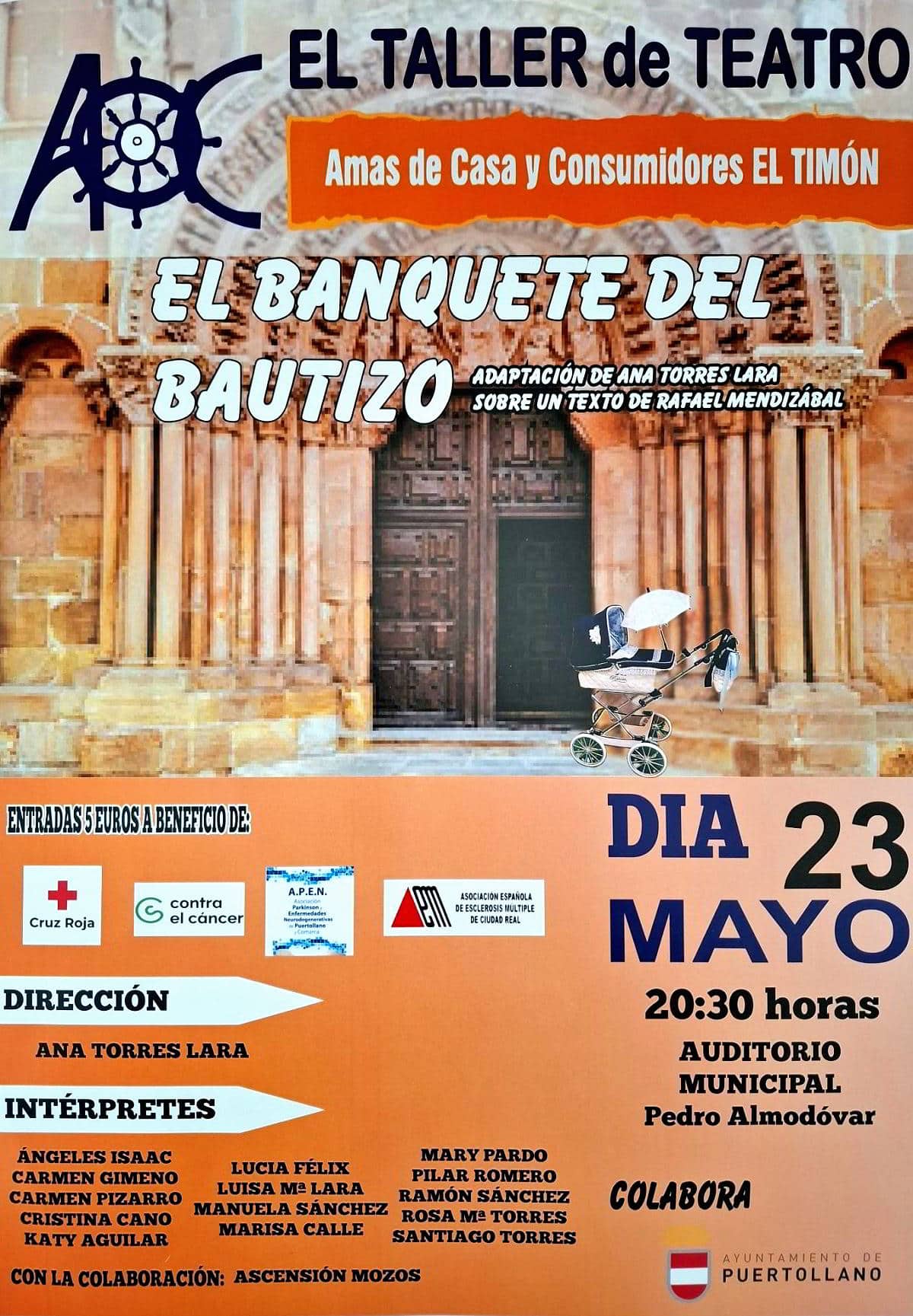 El taller de teatro de Amas de Casa y Consumidores “El Timón” llevará a cabo la representación de la obra “El banquete del bautizo” el próximo viernes 23 de mayo, a las 20:30 horas en el Auditorio Municipal. Este evento tiene un fin benéfico, ya que la recaudación de las entradas, que tienen un precio de 5 euros, irá destinada a apoyar diversas causas solidarias. Entre las organizaciones beneficiarias se encuentran Cruz Roja, la Asociación contra el Cáncer, la Asociación Española de Esclerosis Múltiple y la Asociación de Parkinson y Enfermedades Neurodegenerativas de Puertollano (APEN).