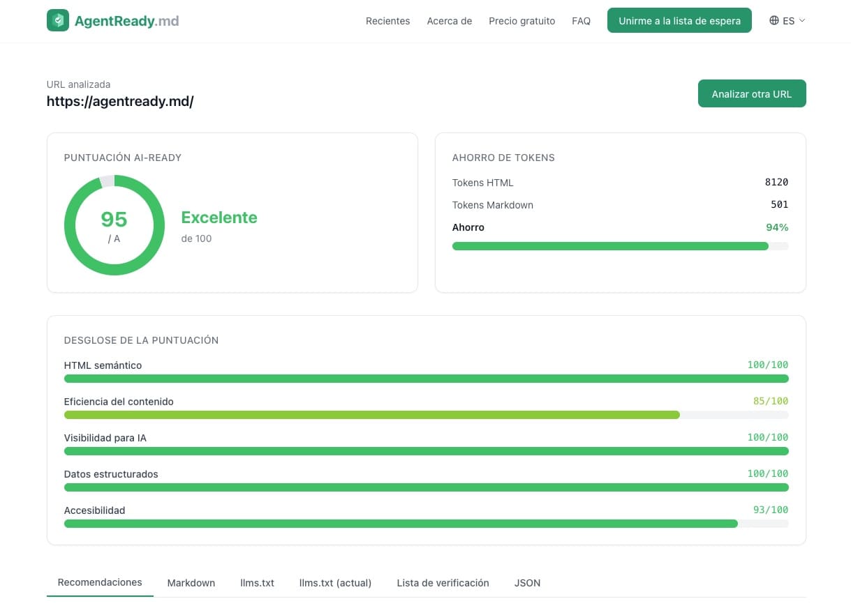 Bajo esta premisa surge AgentReady.md, una herramienta en línea gratuita que permite analizar una URL específica y proporciona, en cuestión de segundos, una puntuación de “preparación para IA” junto con recomendaciones priorizadas y una guía de implementación. Esta herramienta, que opera sin requerir registro y está actualmente en fase beta, limita el uso a cinco análisis por hora, lo que sugiere su enfoque práctico en lugar de auditorías masivas.