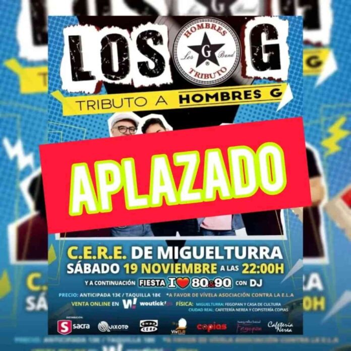 Se ha aplazado el concierto tributo a los Hombres G que se había anunciado para el próximo sábado 19 de noviembre en el CERE de Miguelturra (Ciudad Real). Tal como han informado desde el ayuntamiento de la localidad, la decisión de la empresa organizadora del evento.