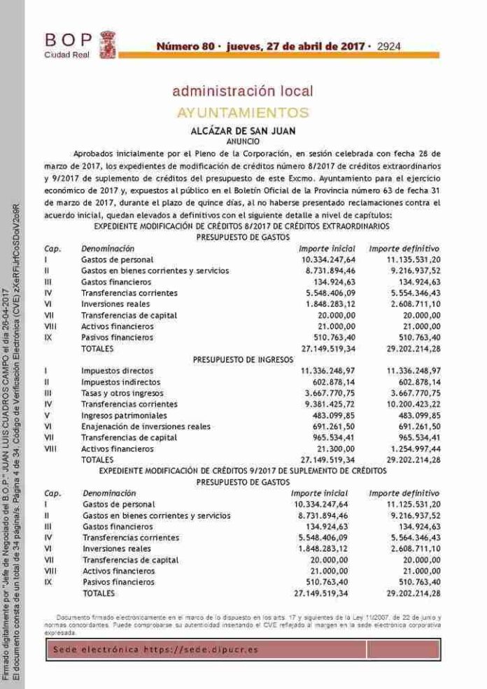 Según refleja el Boletín Oficial de la Provincia, al no haberse presentado reclamaciones contra el acuerdo inicial, quedan elevados a definitivos los expedientes de modificación de créditos número 8/2017 de créditos extraordinarios y 9/2017 de suplemento de créditos del presupuesto del Ayuntamiento de Alcázar.