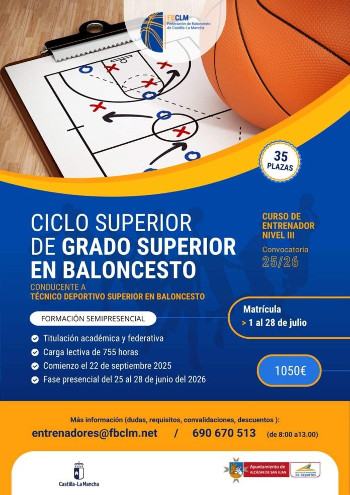 La Escuela Autonómica de Técnicos Deportivos de Baloncesto de Castilla-La Mancha, que opera bajo la Federación de Baloncesto de Castilla-La Mancha (FBCLM), ha comenzado el proceso de inscripción para el ciclo superior del Grado Superior en baloncesto para el curso 2025/2026. Este programa, que se llevará a cabo en junio de 2026, permitirá a los participantes obtener el título de Técnico Deportivo Superior en Baloncesto.