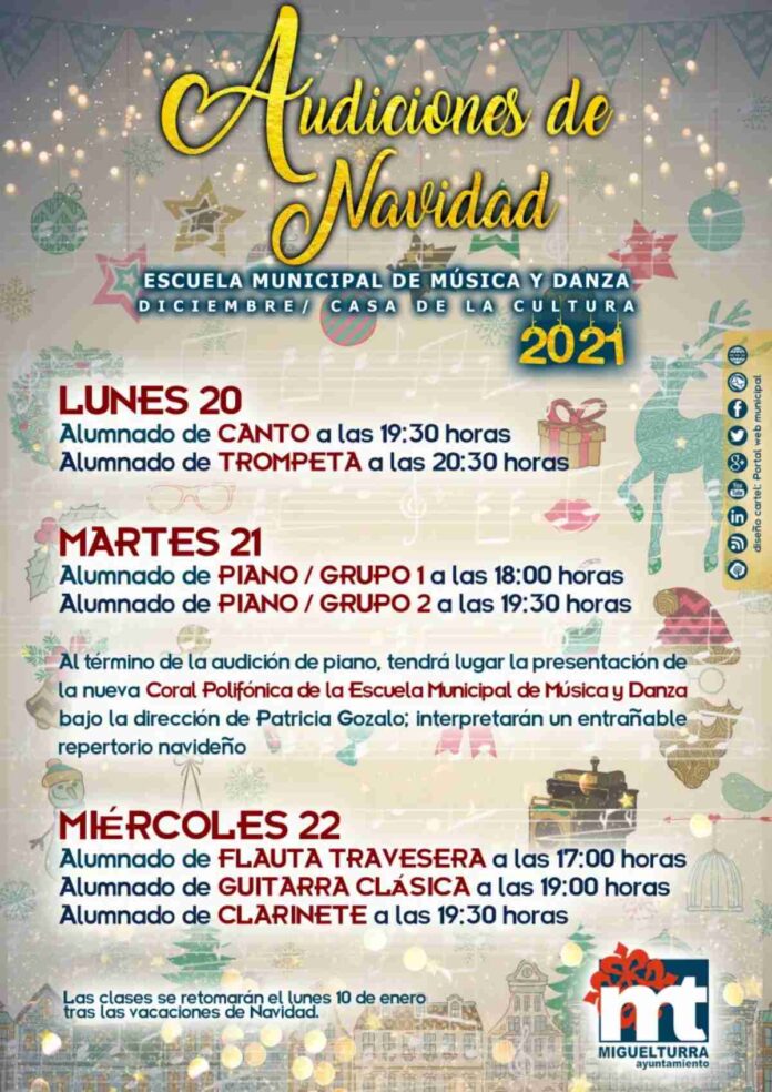 Unos días de audiciones para volver a la actividad musical cotidiana dentro de todos los protocolos de seguridad, ha programado de cara a las fechas navideñas, la Escuela Municipal de Música y Danza, dependiente del Área de Cultura, del ayuntamiento de Miguleturra (Ciudad Real).