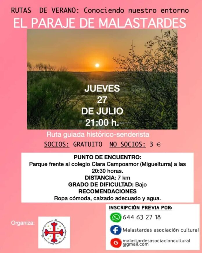 La asociación cultural e histórica «Malastardes» dentro de sus rutas de verano, desarrollará mañana 27 de julio a partir de las 21:00 horas, una ruta senderista. La misma que transcurrirá por el paraje de Malastardes. Y que dará comienzo en el parque frente al Colegio Clara Campoamor a las 20:30 horas; tendrá una distancia aproximada de 7 kilómetros con dificultad baja y apta para cualquier persona, recomendándose llevar calzado y ropa cómoda, además de agua y avituallamiento que considere necesario la persona participante.
