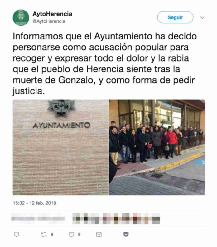 El Ayuntamiento de Herencia (Ciudad Real) ha informado a través de sus redes sociales que se personará como acusación popular para recoger y expresar todo el dolor y rabia que el pueblo de Herencia siente tras la muerte de Gonzalo, y como una forma de pedir justicia.