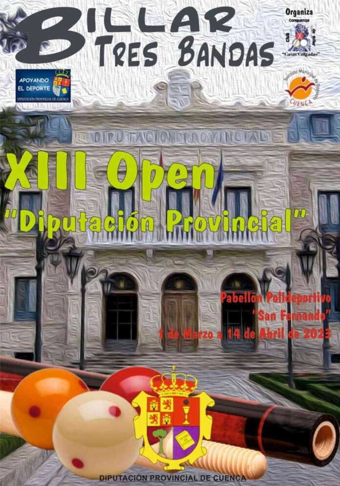 La Diputación de Cuenca ha anunciado el Billar a tres bandas- XIII Open “Diputación Provincial” que se realizará del 1 de marzo al 14 de abril de 2023 en horario de 17 a 21:30 horas excepto domingos y festivos, en el pabellón polideportivo San Fernando.