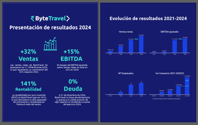 ByteTravel (SCBYT) ha presentado sus resultados financieros para el año 2024, destacando un impresionante crecimiento orgánico y una rentabilidad sobresaliente. Esta empresa, que se especializa en ofrecer servicios auxiliares para viajeros tanto de turismo como de negocios, ha logrado un incremento del 32% en sus ventas y un notable retorno sobre el capital invertido (ROIC) del 141%. Además, ha experimentado una revalorización bursátil extraordinaria del 567% tras su debut en el mercado BME Scaleup en julio de 2024.