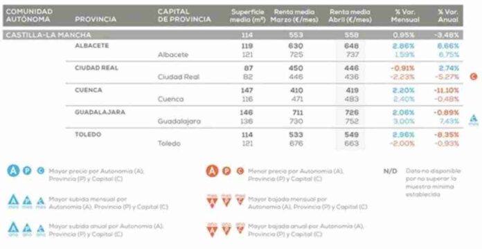 En cuanto a las capitales de la región, Guadalajara (3%) fue la capital de provincia española que más subió frente a marzo. Por otro lado, Ciudad Real (-2,23%) fue la duodécima en el ranking regional de descensos. Interanualmente, Guadalajara (7,43%) fue la cuarta capital española que más creció. En la parte baja, Ciudad Real (-5,27%) registró el recorte más llamativo de la autonomía. En el apartado de rentas medias mensuales, Ciudad Real (436 €/mes) fue la capital de provincia más asequible de España. Por su parte, Guadalajara (752 €/mes) presentó la renta mensual más elevada de Castilla-La Mancha.
