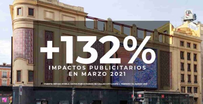 Durante marzo, las pantallas de Callao City Lights incrementaron sus cifras de impresiones y audiencia. Nada menos que más de 9,4 millones de impactos, lo que significa un 132% más que en el mes anterior, en el que se alcanzaron 4 millones. Además, durante ese periodo analizado la audiencia se duplicó, pasando de 1 millón de usuarios, en febrero, a 2 millones, en marzo.