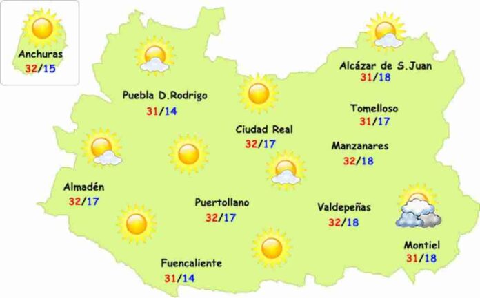 Para el martes primero vamos con el estado del cielo que es lo que presentará pocos cambios. Nos espera un martes de sol en toda la provincia de Ciudad Real con el paso de algunas nubes altas poco numerosas, quizás con algún pequeño cúmulo de evolución en el Campo de Montiel sin ninguna consecuencia.