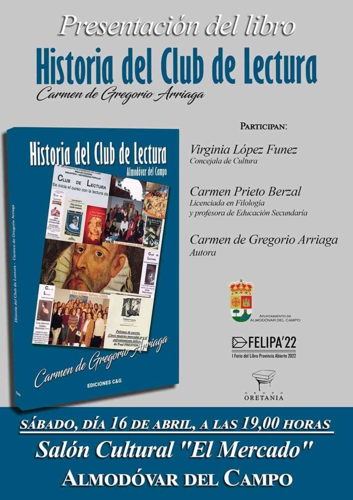 El sábado, 16 de abril, en el ‘Salón Cultural El Mercado’ de Almodóvar del Campo (Ciudad Real), a las 19,00 horas, tendrá lugar la presentación del libro “Historia del Club de Lectura” de Carmen de Gregorio Arriaga, con la presencia, además de la autora, de la concejala de Cultura, Virginia López Funez y de la profesora de Educación Secundaria y licenciada en Filología, Carmen Prieto Berzal. El libro ha sido editado por Ediciones C&G del Grupo Oretania y está contemplado dentro de la programación del proyecto cultural FELIPA’22.