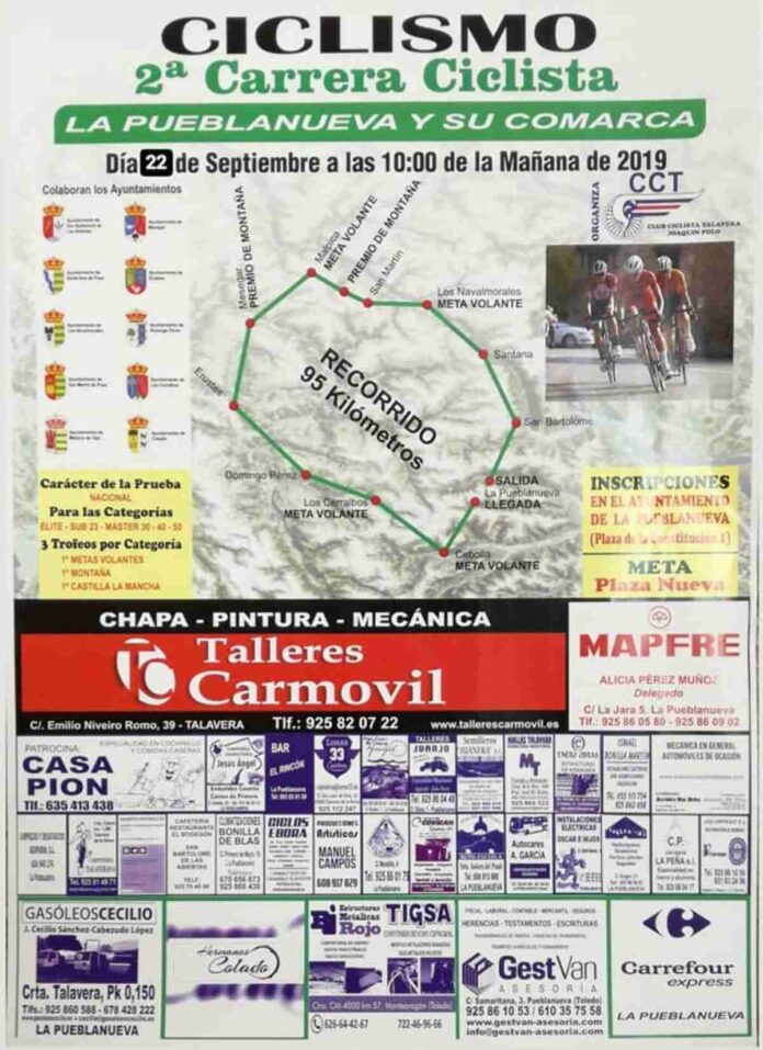 La II edición de la Carrera Ciclista Pueblanueva y su comarca, se celebrará el 22 de septiembre. Será a las 10 de la mañana cuando de inicio esta carrera organizada por el Club Ciclista Talavera Joaquín Polo. La prueba que es de carácter nacional está destinada a las categorías élite, sub23 y Máster 30, 40 y 50. La salida y llegada será en la localidad en esta localidad toledana. Y la carrera se disputará sobre un circuito circular de unos 97 kilómetros.