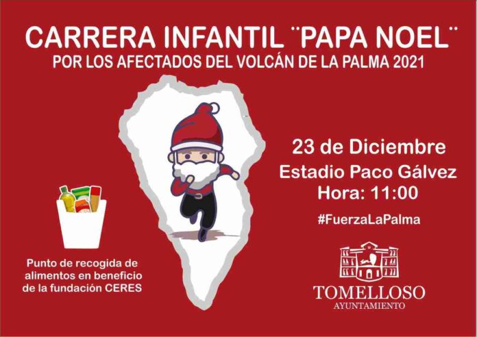La Carrera Infantil “Papá Noel” tendrá lugar el 23 de diciembre en el Estado Municipal “Paco Gálvez” de Tomelloso (Ciudad Real) a beneficio de los afectados por el volcán de La Palma. En la misma participarán escolares de todos los centros educativos de la localidad, desde chupetines a cadetes y tendrá carácter no competitivo