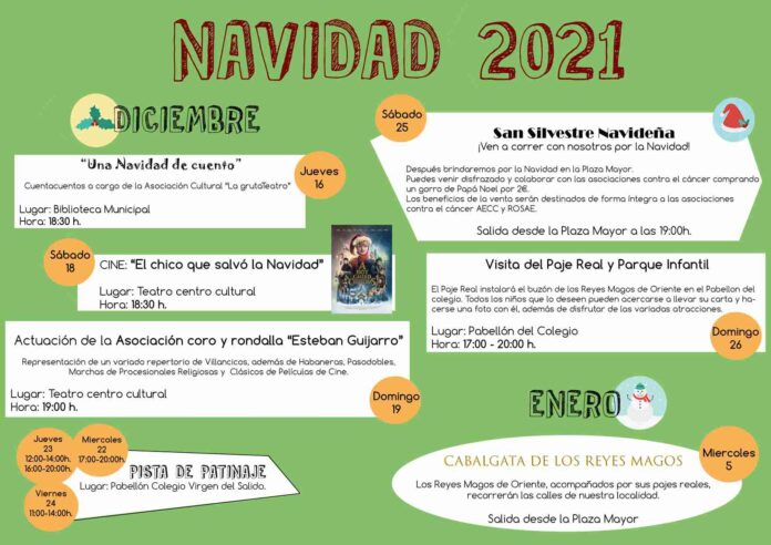 La Navidad arrancará en Carrizosa este jueves, 16 de diciembre, con “Una Navidad de cuento”, un cuentacuentos a cargo de la Gruta Teatro que se celebrará en la Biblioteca a las 18.30 horas. El sábado 18 habrá cine; se proyectará la película “El chico que salvó la Navidad” a las 18.30 horas en el Teatro Centro Cultural donde el domingo 19, a las 19.00 horas, tendrá lugar la actuación de la Asociación coro y rondalla “Esteban Guijarro” que representará un variado repertorio de villancicos, además de habaneras, pasodobles, marchas de procesiones religiosas y clásicos de películas de cine.