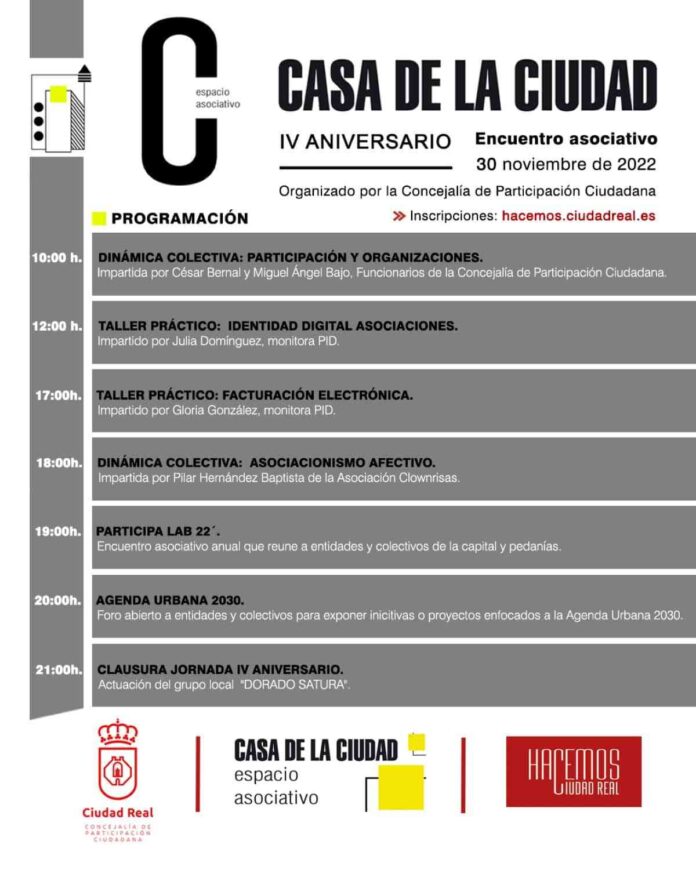 Encuentro asociativo mañana 30 de noviembre de Casa de la Ciudad IV aniversario. Con algunas actividades de gran interés y organizadas por la concejalía de Participación Ciudadana del ayuntamiento de Ciudad Real. Las inscripciones para participar se pueden realizar en hacemos.ciudadreal.es