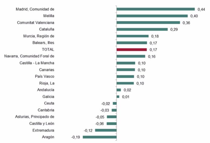 A nivel regional, la Encuesta señala que 12 comunidades autónomas y la ciudad autónoma de Melilla han experimentado aumentos en su población. Destaca que la Comunidad de Madrid lidera este crecimiento con un 0,44%, seguida por Melilla (0,40%), la Comunitat Valenciana (0,36%), Cataluña (0,29%), Murcia (0,18%) y Baleares (0,17%). Por otro lado, Castilla-La Mancha, a pesar de haber crecido con la incorporación de 2.184 residentes, se sitúa por debajo de la media nacional con una tasa del 0,10%.