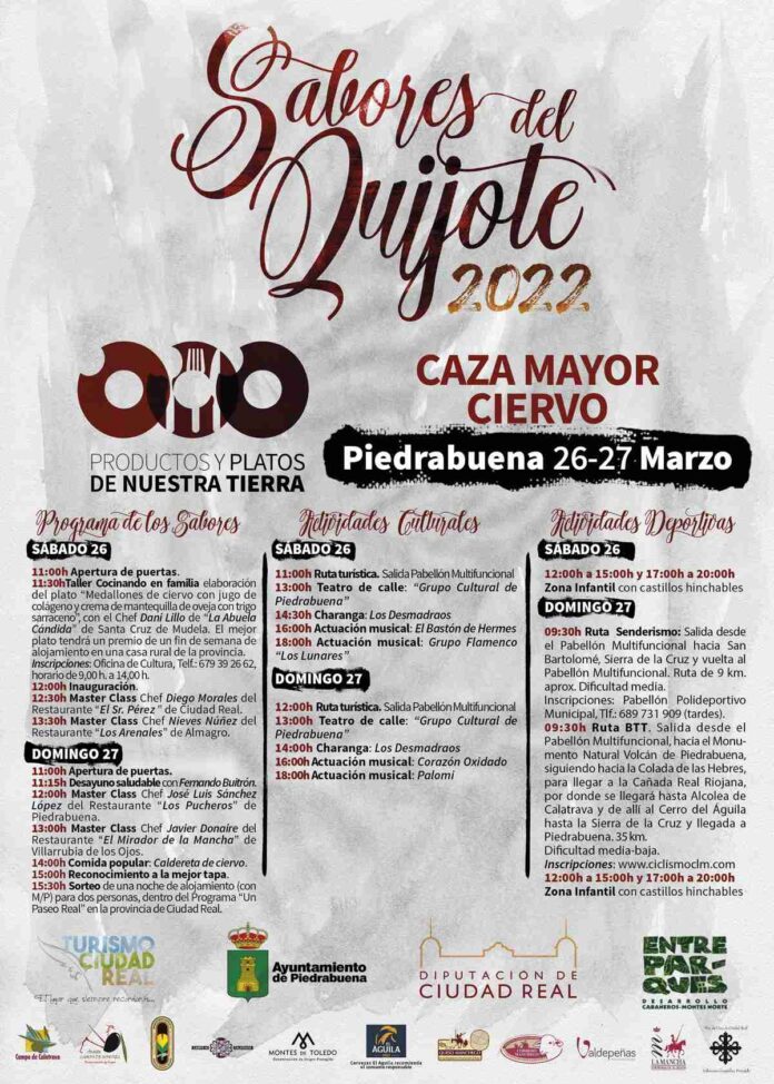 La Caza Mayor Ciervo este fin de semana en Piedrabuena con una estupenda programación de “Sabores del Quijote”. La iniciativa de la Diputación de Ciudad Real. La apertura será el sábado 26 a las 11 horas. Y a las 11:30 un taller de cocina con el chef Dani Lillo de “La abuela Cándida” de Santa Cruz de Mudela.