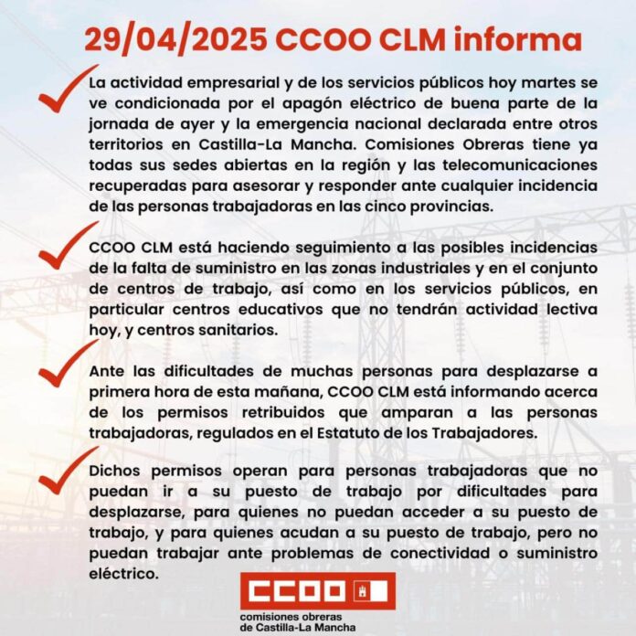 Comisiones Obreras ha conseguido reabrir todas sus sedes en esta región, restableciendo las telecomunicaciones, lo que resulta esencial para proporcionar apoyo y respuesta ante cualquier incidencia que puedan enfrentar los trabajadores en las cinco provincias afectadas. La restauración de estos servicios es crucial para minimizar el impacto en el sector productivo y en los servicios públicos, lo que busca facilitar el regreso paulatino a la normalidad. Mientras ello ocurre, las autoridades continúan vigilantes ante posibles incidentes derivados de la situación generada por el apagón.