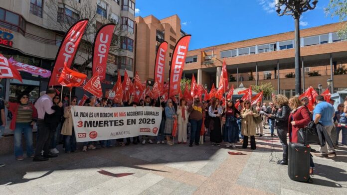 Delegados y delegadas de CCOO y UGT en Albacete se congregaron este lunes en la Plaza Mayor para reclamar entornos laborales más seguros, coincidiendo con el Día Mundial de la Seguridad y Salud en el Trabajo, que se celebra anualmente el 28 de abril. En esta ocasión, los sindicatos enfatizaron la necesidad de intensificar las medidas preventivas en las empresas locales, destacando la creciente preocupación por el aumento de la siniestralidad laboral.