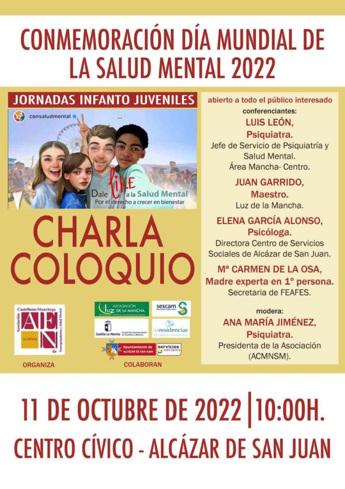 La Asociación Castellano – Manchega de Neuropsiquiatría y Salud Mental se suma a la conmemoración del Día Mundial de Salud Mental con la celebración de diferentes actos en la Comunidad. En Alcázar participa junto a las actividades organizadas por la Asociación Luz de la Mancha, CRPSL de Alcázar y el Centro de Servicios Sociales. Además del manifiesto de la Asociación en relación con la Salud Mental en nuestra comunidad, han organizado una charla coloquio el 11 de octubre, centrada en Infancia y Adolescencia, siguiendo el lema del Día Mundial de este año: ‘Dale “like” a la Salud Mental. Por el derecho a crecer en bienestar ‘.