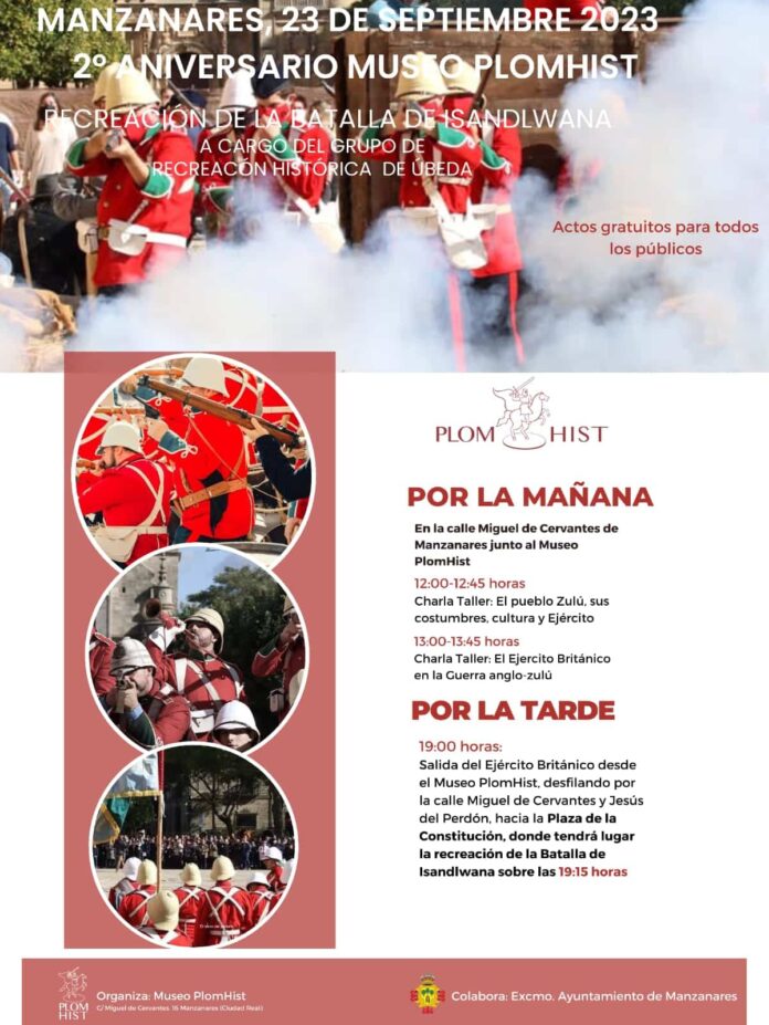 Recreación histórica de la guerra anglo-zulú para conmemorar el II aniversario del Museo PlomHist de Manzanares (Ciudad Real) este 23 de septiembre por el Grupo de Recreación Histórica de Úbeda que brindará dos charlas sobre la guerra anglo-zulú. Sin duda una interesante jornada de divulgación y recreación histórica, en un viaje a 1879 y la representación de la Batalla de Isandlwana.